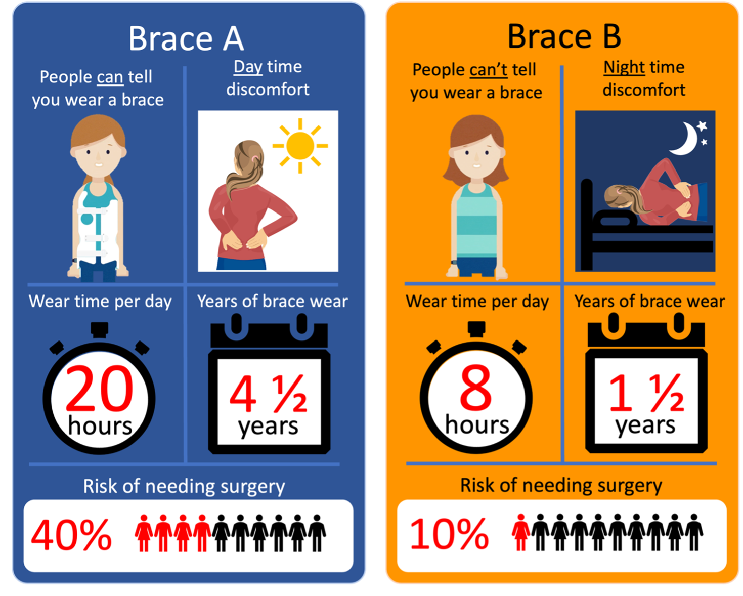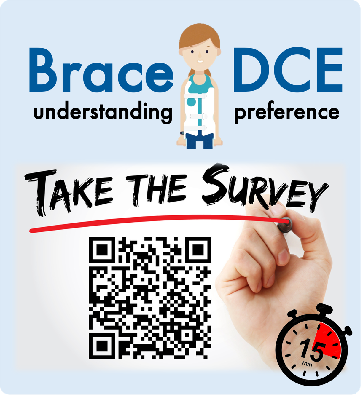 The Brace DCE (discrete choice experiment) study is a special type of survey. It helps us understand the best way to treat young people with scoliosis, by understanding their preferences in brace treatment. Young people aged 10-18 years with scoliosis are invited to take part. In the questionnaire participants will choose between two options they would prefer. Each brace option has different features. The questionnaire will look a like this: